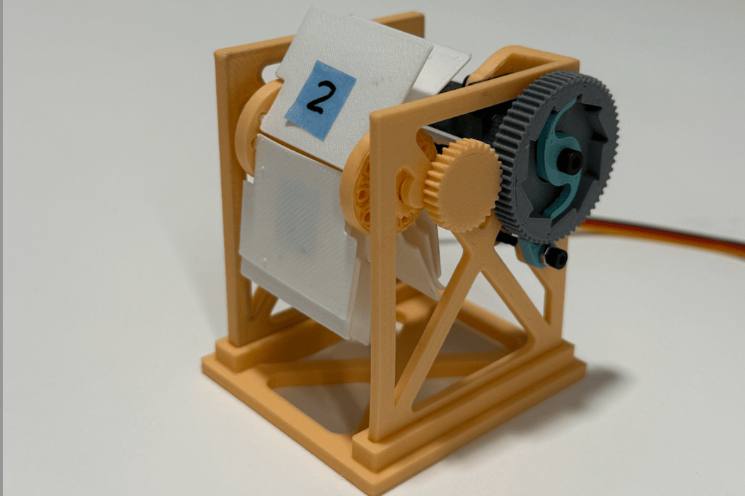 A major design constraint in this project was only being allowed to use one servo motor that had 180 degrees of motion. In order to execute the flip clock design, I needed a full 360 degrees of motion. To get around this, I designed a ratchet mechanism so that every time the servo reached the limit to its range of motion, it could return to 0 degrees without disrupting the clock position.