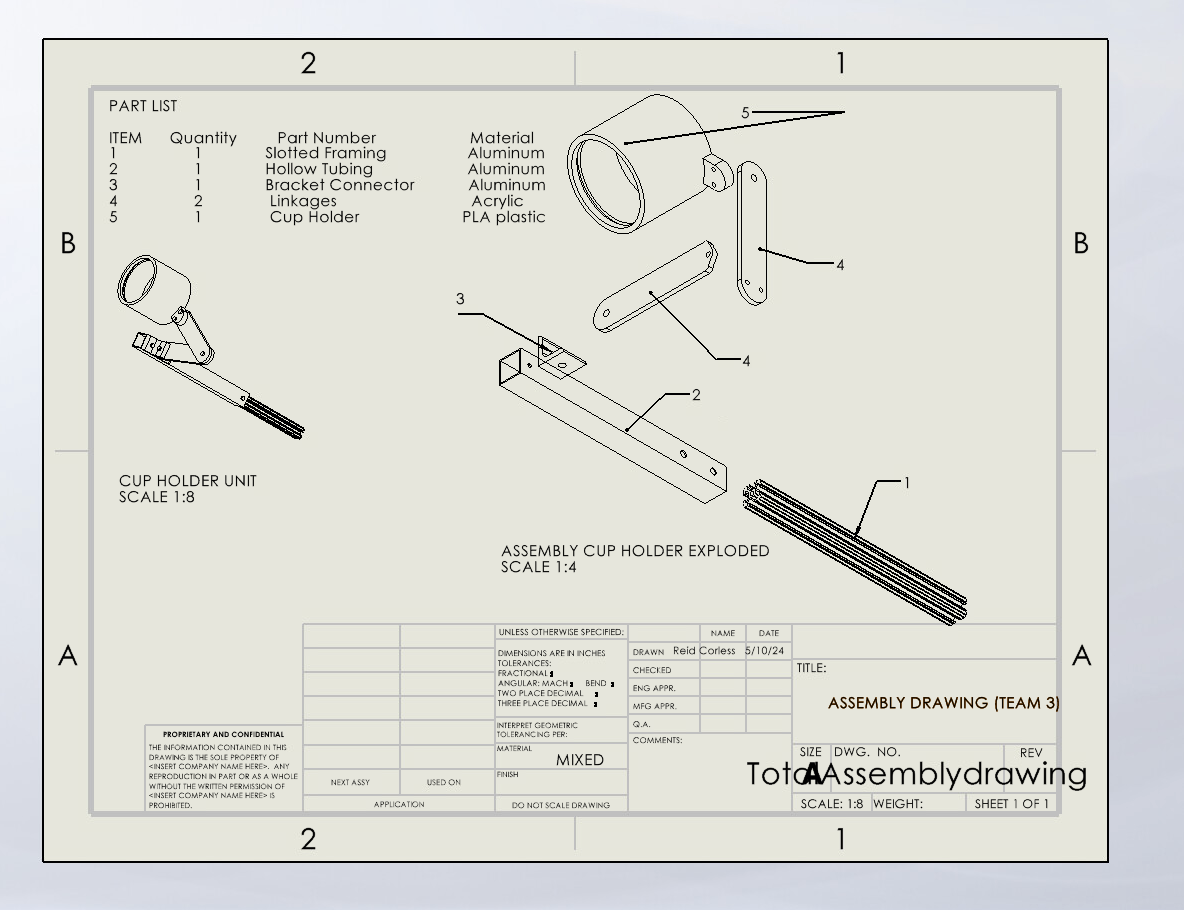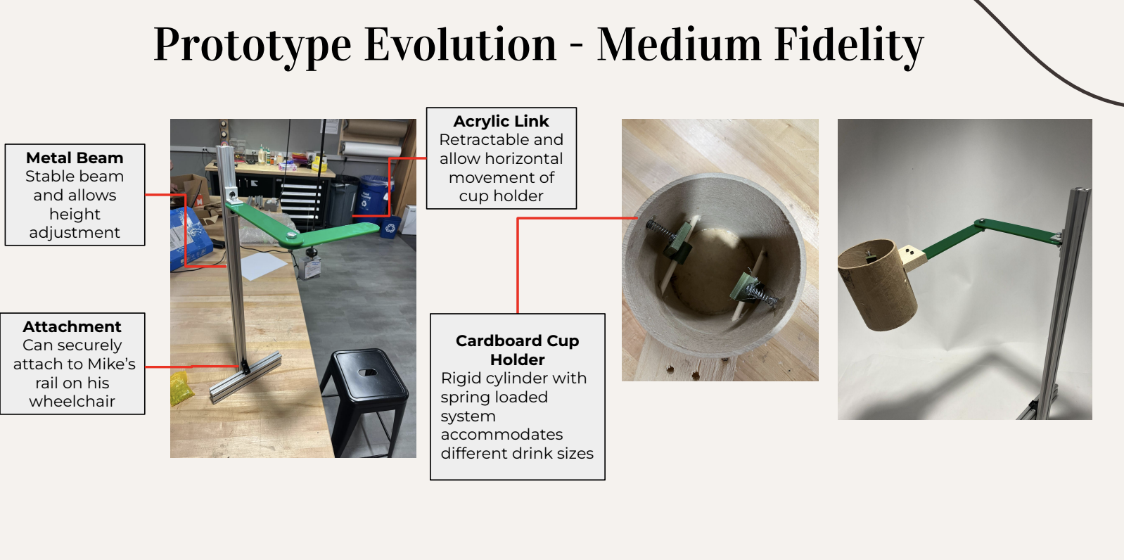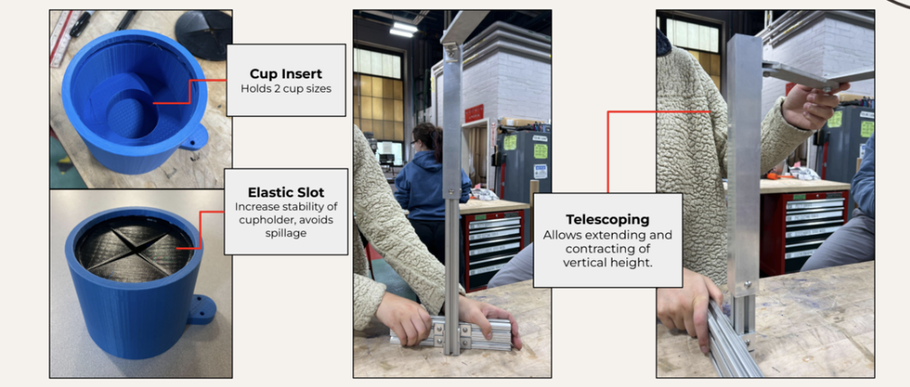 Through talking with our client, we learned that they wanted to have the design be as unobtrusive as possible. So while in the low-fidelity phase, we experimented with a bunch of mechanisms on how to make our design as low-profile as possible. We also experimented with differnet ways we could accomodate different drink sizes on the cupholder end of things.