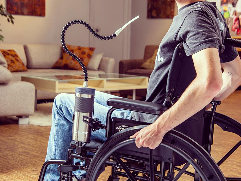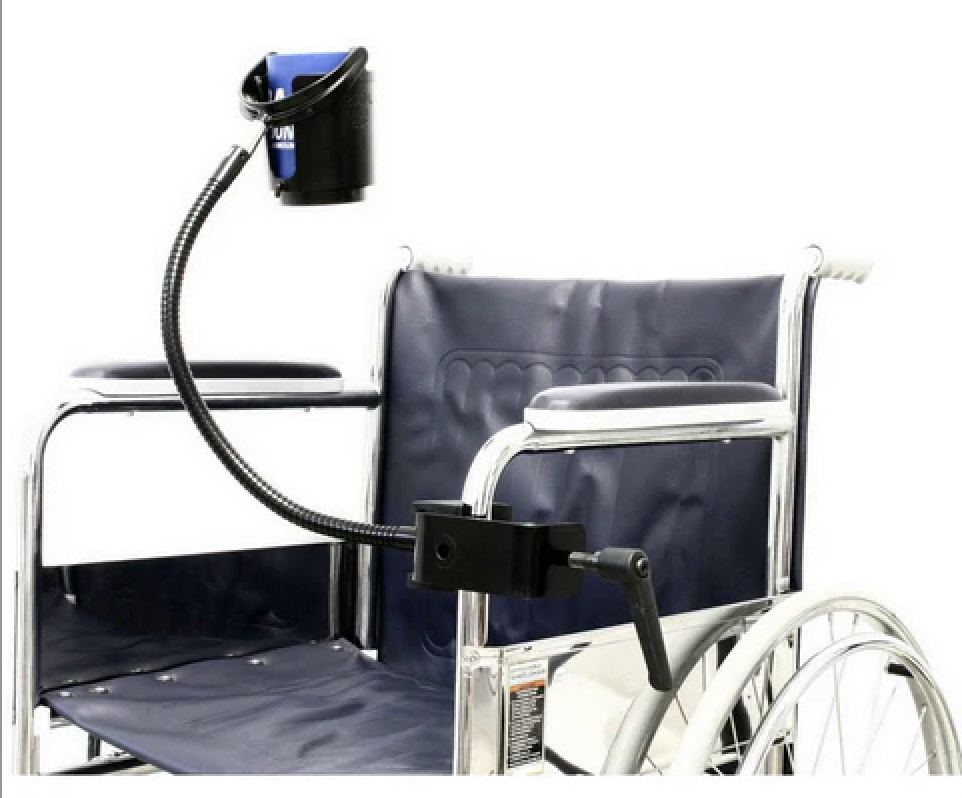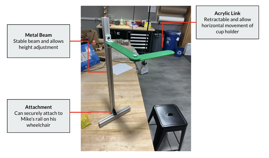 Our client for this project had Duchenne Muscular Dystrophy which resulted in them having no movement below the neck. Because of this, they have trouble drinking without the help of a caregiver. They currently have a stationary drink holder is essentially an elevated table which allows them to drive their powered wheelchair up to the cup and drink, however, this solution is limited becuase it doesn't allow for independence when they are outside of the house. Our task was to create a device that would enable our client to drink independently on the go.