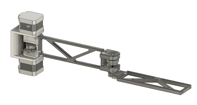 The idea was that while the user was drawing on one side, encoders at the "elbow" and "shoulder" joints would be reading angular data, and sending to the output side through a Raspberry Pi. Another pro I discovered about using capstan drives was that it allowed for both of the motors to be placed at the "shoulder" joint on the output side. Because the weight of the "elbow" motor was now off of the arm, deflection was now much less of an issue and I was able to make the arms of the robot ultra thin and light.