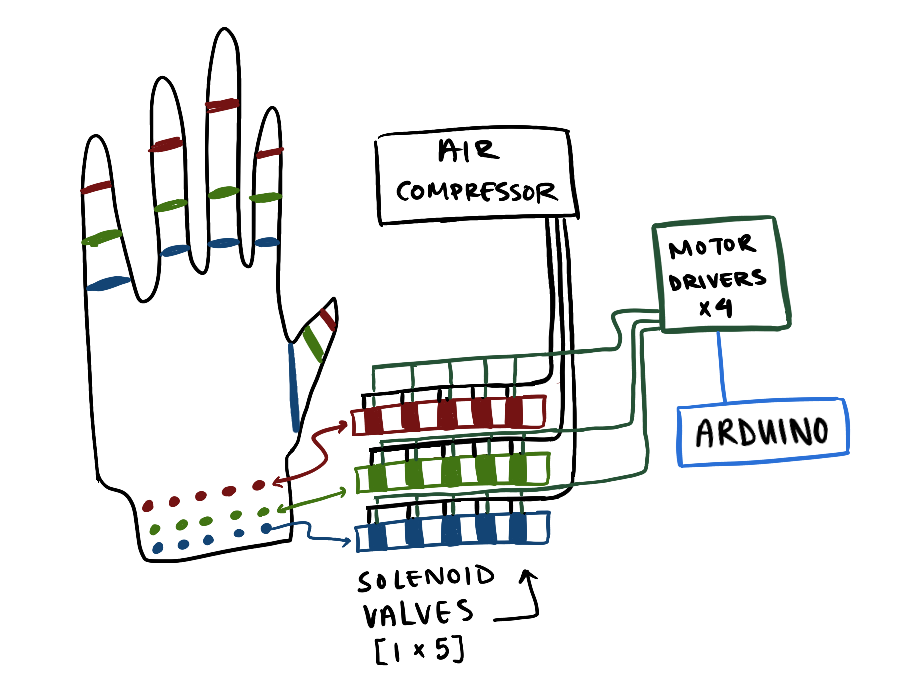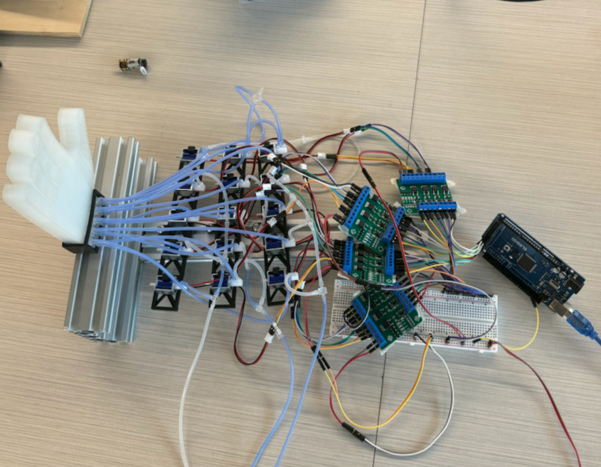 This electromechanical system was a monster to set up. I really wanted each joint to be individually controllable, which ment wiring up 15 solenoid valves both the the microcontroller and the air compressor - one for each of the 3 joints on each of the fingers.